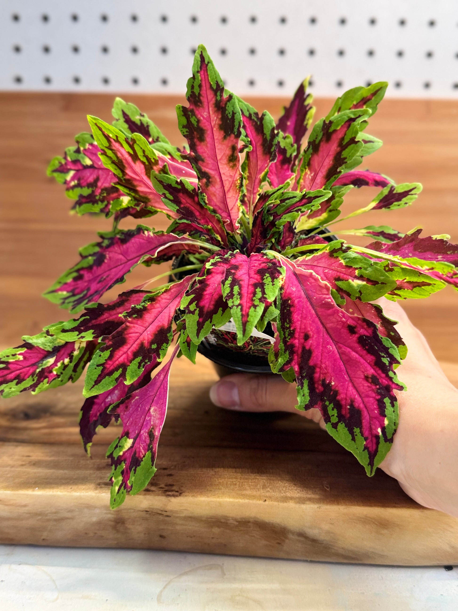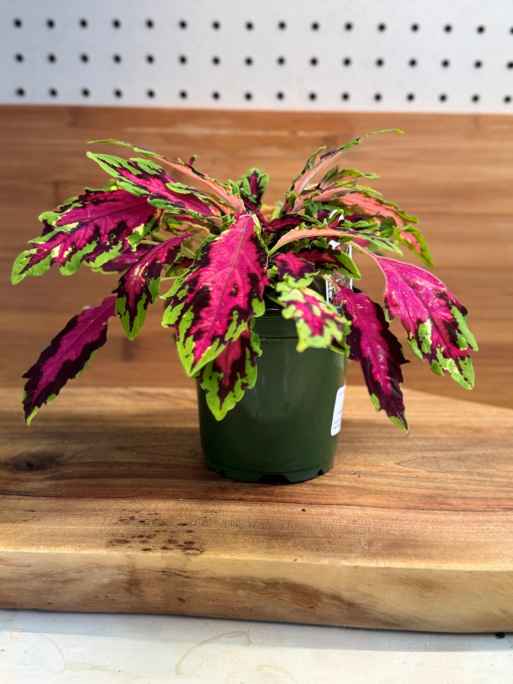 Add a bold pop of color to your garden or patio with Coleus ‘Spitfire’! This eye-catching variety features narrow, serrated leaves with vibrant hot pink centers, deep burgundy accents, and bright green edges. Compact and easy to grow, it thrives in sun or shade and is perfect for containers, borders, or mixed arrangements. Grown in a 4” pot, this low-maintenance plant brings nonstop color all season long without the need for flowers. A great choice for adding texture and tropical flair to any space!